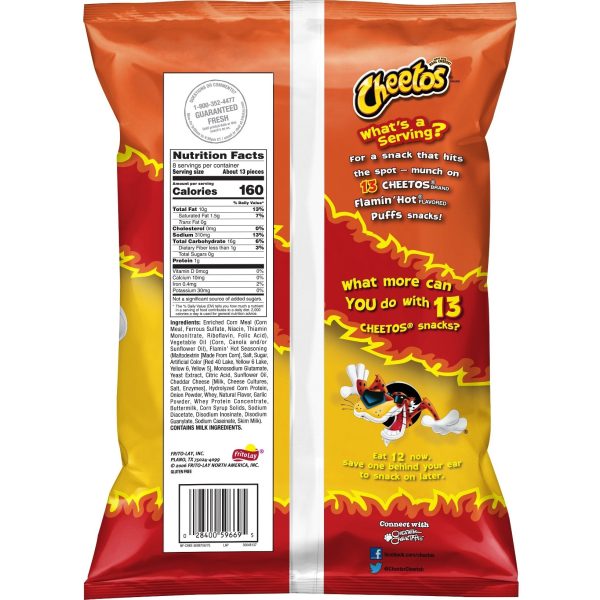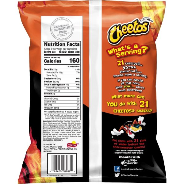 u0026bull;Includes 1 (8.5oz) bag of Cheetos Xxtra Flamin’ Hot Crunchy Cheddar Cheese Snacksu003cbru003eu0026bull;Turn up the heat with extra hot, spicy flavor packed into crunchy, irresistible cheese snacksu003cbru003eu0026bull;Made with real cheeseu003cbru003eu0026bull;They’re finger lickin’ good- add some cheesy smiles to your next gathering with this shareable bagu003cbru003eu0026bull;Try packing about 18 cheetos crunchy snacks for your next work or school lunch- that’s just the right amount for fun to the max!