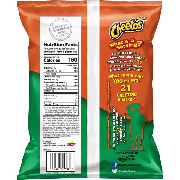 u0026bull;Includes 1 (8.5oz) bag of Cheetos Cheese Snacks, Cheddar Jalapeno flavoru003cbru003eu0026bull;Bold, cheesy Cheetos meet spicy Jalapeno in this dangerously cheesy snacku003cbru003eu0026bull;Made with real cheeseu003cbru003eu0026bull;Perfect to add some hot cheesy flavor to your next gathering
