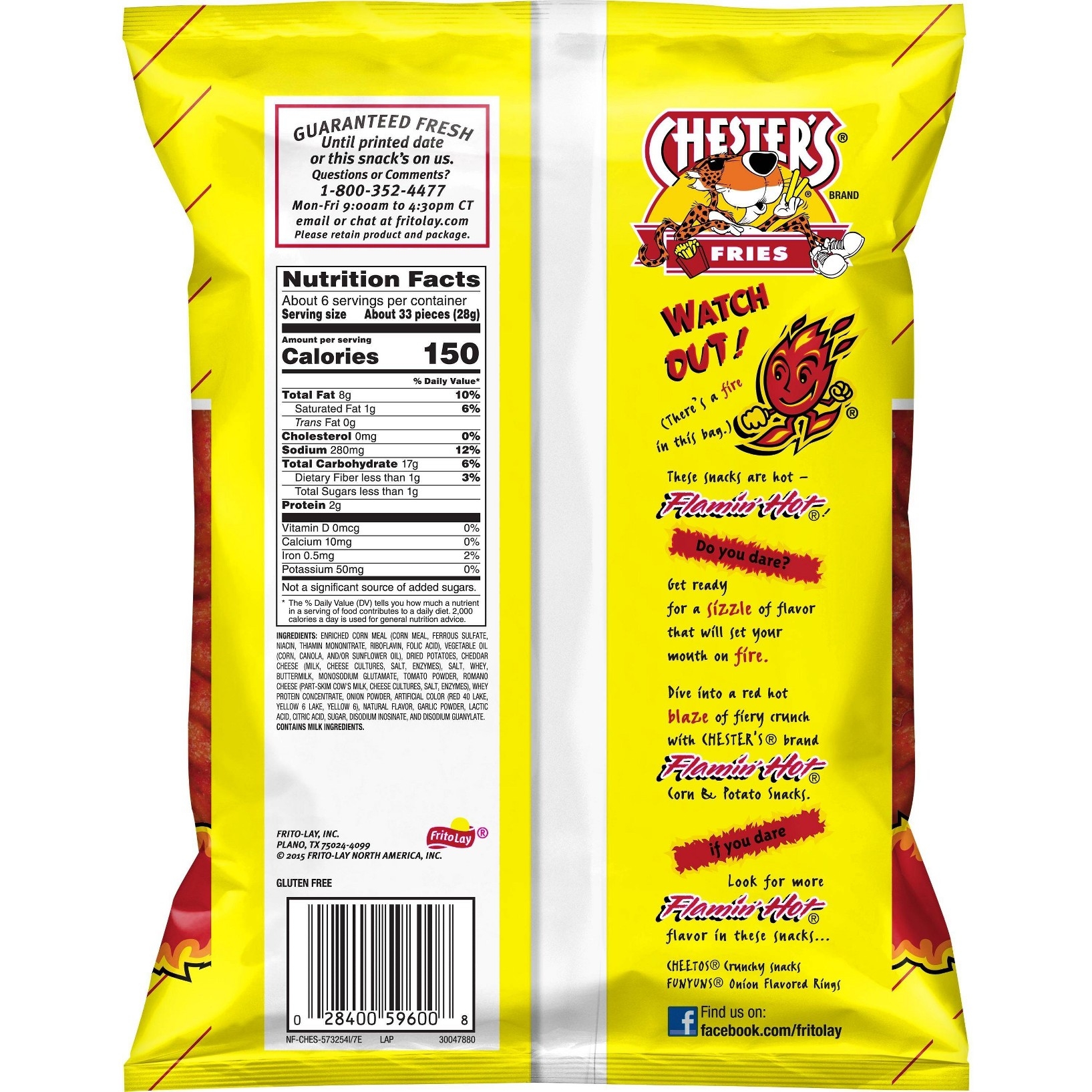 u0026bull;Includes 1 (5.5oz) bag of Chester’s Fries, Flamin’ Hot flavoru003cbru003eu0026bull;Get ready for a sizzle of flavor that will set your mouth on fireu003cbru003eu0026bull;Turn up the heat at your next party or gathering with this shareable bagu003cbru003eu0026bull;Gluten Free productu003cbru003eu0026bull;Try packing about 33 Flamin’ Hot Fries to add some bold, cheesy heat to your net work or school lunch