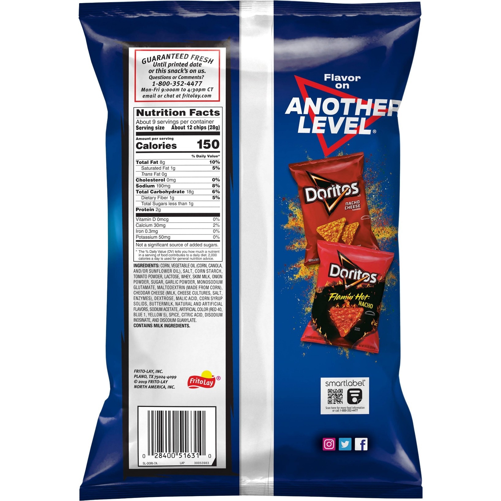 u0026bull;Includes 1 (15.5oz) bag of Doritos Tortilla Chips, Cool Ranch flavoru003cbru003eu0026bull;Made with whole corn and seasoned with hints of onion, garlic, tomato and spice that merge together in a bold creamy, cool ranch blendu003cbru003eu0026bull;Enjoy these crunchy tortilla chips straight from the bag or after scooping up fresh salsa or dipu003cbru003eu0026bull;Try packing about 10 tortilla chips to add just the right amount of bold, zesty flavor to your next lunch at work or schoolu003cbru003eu0026bull;Bring a burst of awesome to your next party or gathering with this shareable size