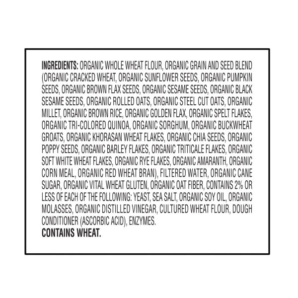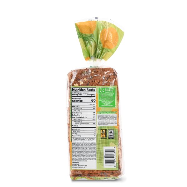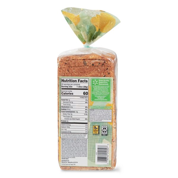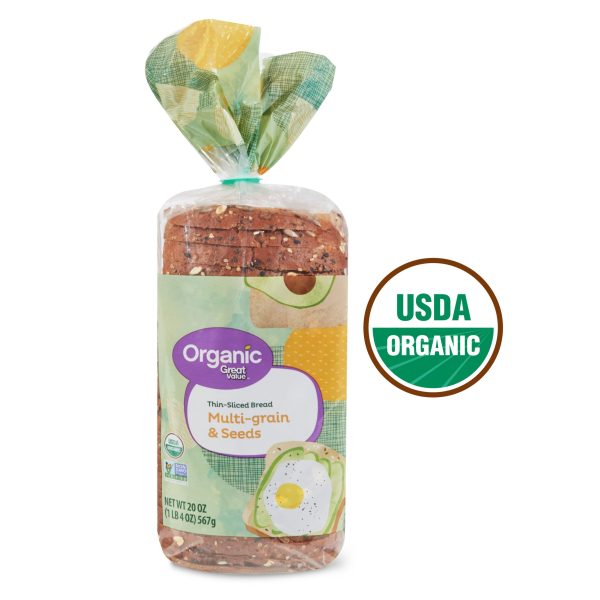 With its robust flavor and texture, Great Value Organic Multi-Grain & Seeds Thin-Sliced Bread makes a versatile addition to nearly every meal. Each wholesome loaf contains 20 slices of nutritious, USDA certified organic bread that is free of trans fat but rich in dietary fiber, potassium, and iron. Toast a tasty, multi-grain slice before topping it with butter and jam to round out your classic bacon and eggs breakfast, or add your favorite deli meats, veggies, and condiments. Great Value Organic Multi-Grain & Seeds Thin-Sliced Bread is sure to become your next favorite bread for sandwiches and meals, alike.