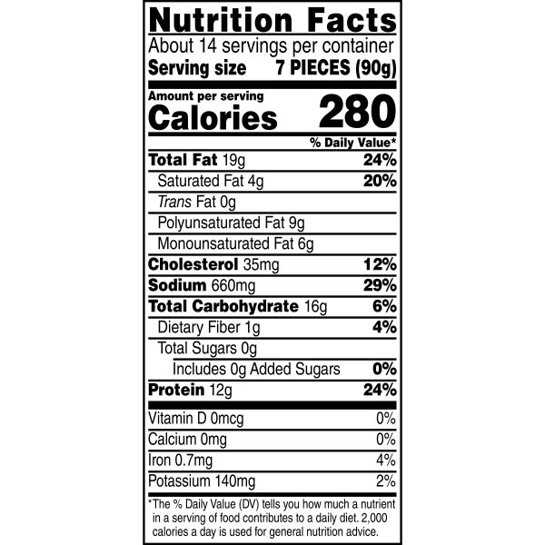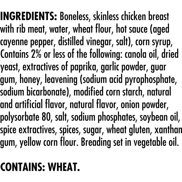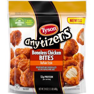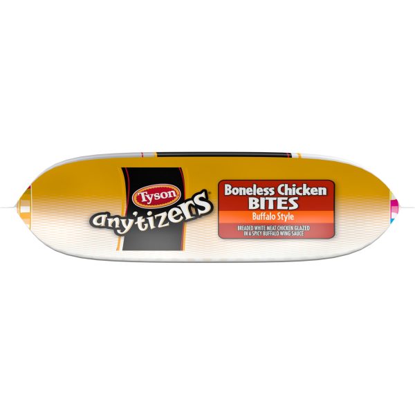 Take snack time to the next level with Tyson Any’tizers Buffalo Style Boneless Chicken Bites, now with new bolder flavor. A spicy, tangy kick for your taste buds, these juicy, flavor packed Buffalo chicken bites are ready to satisfy all your snacking needs. Each bite is coated with buffalo style goodness and has just the right amount of crispy breading. Made with boneless all white meat chicken, these convenient, fully cooked chicken bites are a breeze to prep from frozen in the oven, microwave or air fryer. These tender bites are made with chicken raised with no antibiotics ever, no added hormones or steroids*, and provide 12 grams of protein per serving. Heat and serve these crave worthy breaded chicken bites as an alternative to chicken nuggets. Includes one 24 oz resealable package of chicken bites. Keep it real. Keep it Tyson. Look for other Tyson snacks including our Buffalo wings for the fryer and baked Buffalo chicken wings. *Federal regulations prohibit the use of added hormones or steroids in chicken.