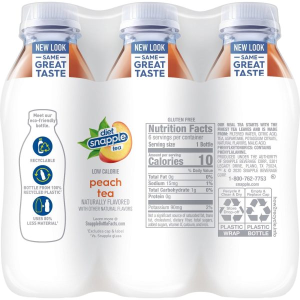 u0026bull;PACKAGING MAY VARY: Snapple has a New Look, Same Great Taste. You may receive either version in your order throughout this packaging changeu003cbru003eu0026bull;100% RECYCLED: We’ve got a new look and a new bottle that is recyclable and made from 100% recycled plastic (excludes cap and label)•FLAVOR: Get ready Snapple Diet Peach Tea, a great-tasting combo tea blended with peach flavoru003cbru003eu0026bull;QUALITY INGREDIENTS: Our teas, juices and lemonades are made with only the highest quality ingredientsu003cbru003eu0026bull;ALL NATURAL: Snapple Diet Peach Tea is low in calories and contains no artificial flavorsu003cbru003eu0026bull;REAL TEA: Snapple Diet Peach Tea is made with green tea and black teas plus lemon flavoru003cbru003eu0026bull;TRUSTED BRAND: We started selling our apple juice to health clubs in 1973 and have since diversified our flavor portfolio into teas, fruit juices and lemonades