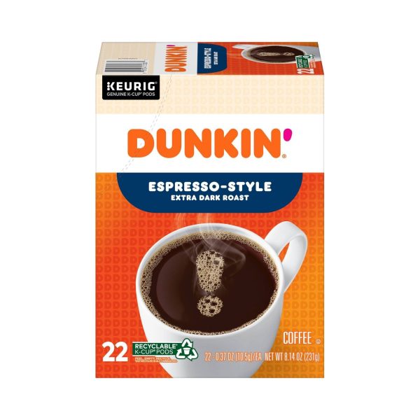 u0026bull;Contains one (1) box of 22 Dunkin’ Espresso-Style Extra Dark Roast K-Cup podsu003cbru003eu0026bull;Bold taste inspired by the Dunkin’ espresso you get from Dunkin’ shopsu003cbru003eu0026bull;Convenient coffee pods for Keurig machines, no other equipment requiredu003cbru003eu0026bull;100% premium Arabica coffee, specially roasted for great bold flavoru003cbru003eu0026bull;Delicious, full-bodied espresso-style taste that stands up to cream, sugar and flavored syrups