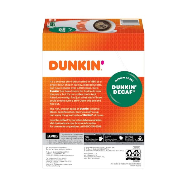 u0026bull;Medium roast coffee, specially blended and roasted to deliver the same great taste as the brewed Dunkin’ coffee available in Dunkin’ shopsu003cbru003eu0026bull;The rich, smooth taste of Dunkin’ Original Blend, only decaffeinatedu003cbru003eu0026bull;Enjoy in any Keurig K-Cup Brewer for an authentic Dunkin’ experience in no timeu003cbru003eu0026bull;Enjoy the great taste of Dunkin’ at home