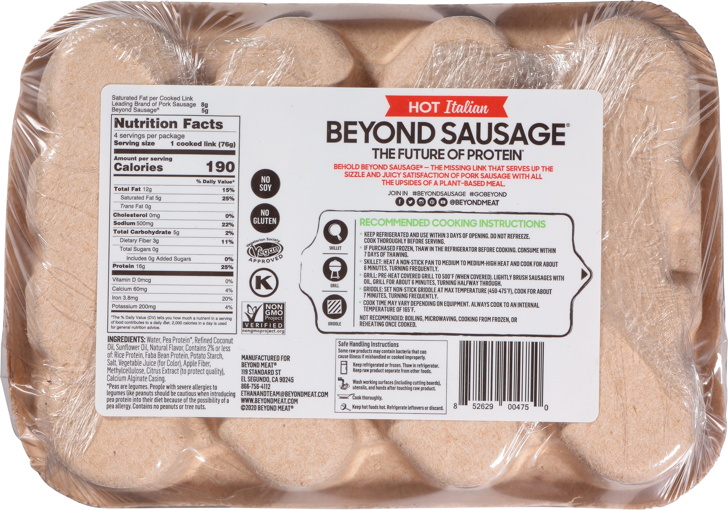 From grill to frying pan, Beyond Sausage is stuffed with delicious flavor and satisfying sizzle. It’s also an excellent source of protein (16g per serving), has no cholesterol, and is lower in saturated fat (35% less than a leading brand of pork sausage). Made from simple plant-based ingredients – like peas, brown rice and faba beans – our Beyond Sausage has no GMOs, soy or gluten. Each pack contains 4 plant-based links that can be thrown in a bun, put on kebabs, sliced onto pizza or crumbled into sauce. Enjoy every bite. See nutrition panel for fat, sat fat and sodium content.