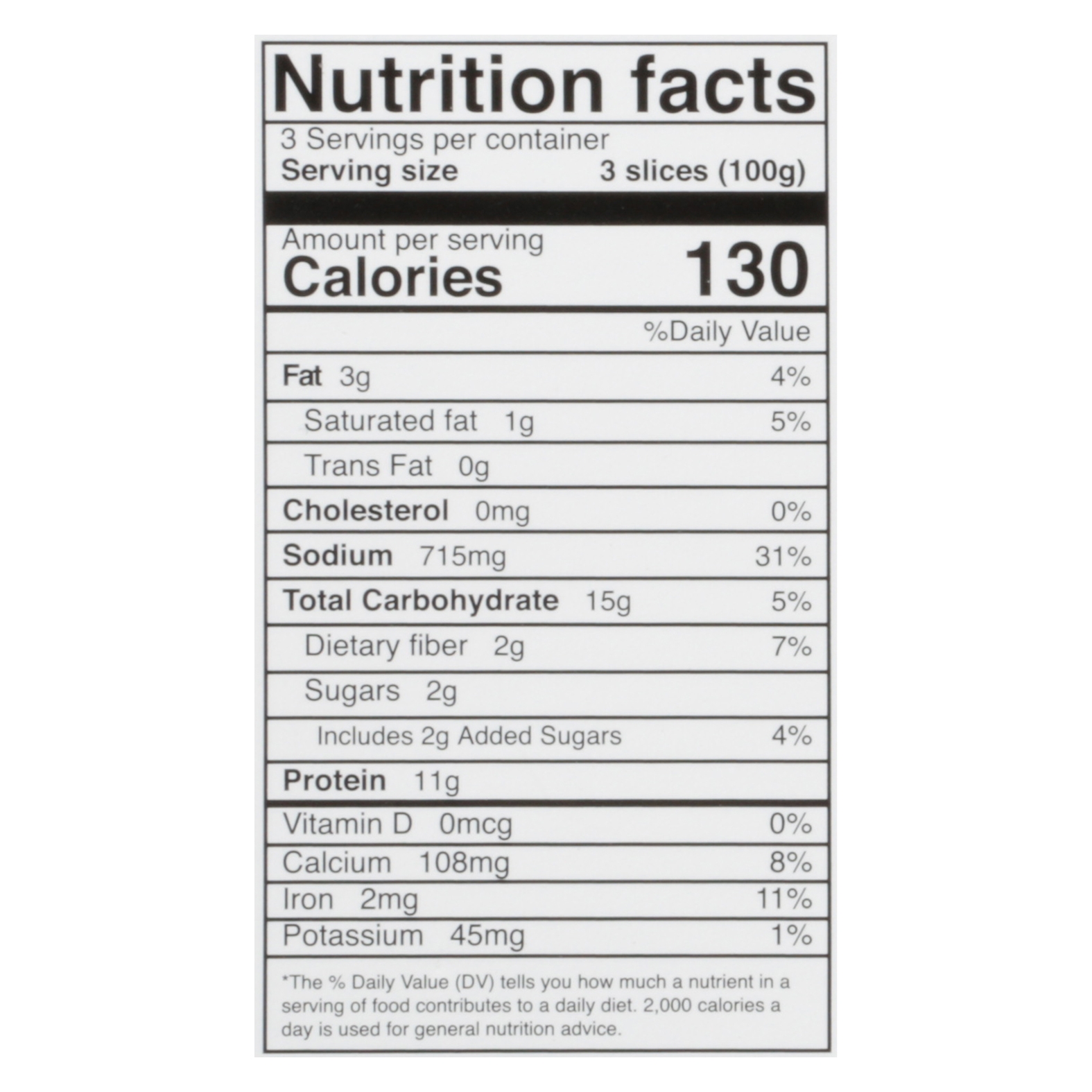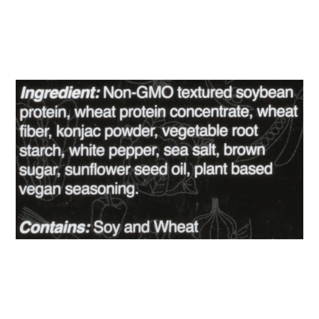 Non-GMO textured soybean protein, Non-GMO wheat fiber, wheat protein concentrate, konjac powder, vegetable root starch, white pepper, sea salt, brown sugar, sunflower seed oil, plant based vegan seasoning.