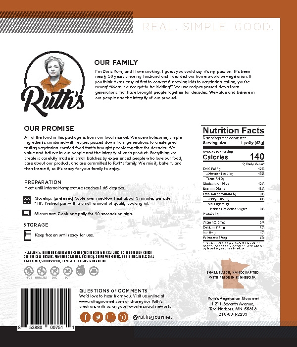 I’m Doris Ruth, and I love cooking. It’s my passion. These delicious vegetarian recipes have been cherished by my family since the 1960s and have brought so many people together. I believe that nothing brings a family together like a home-cooked meal. Everything we create is carefully perfected in our kitchen in Two Harbors, MN. All of our products are frozen to protect nutrients and flavor without the need for preservatives. They are fully cooked and easy to prepare.