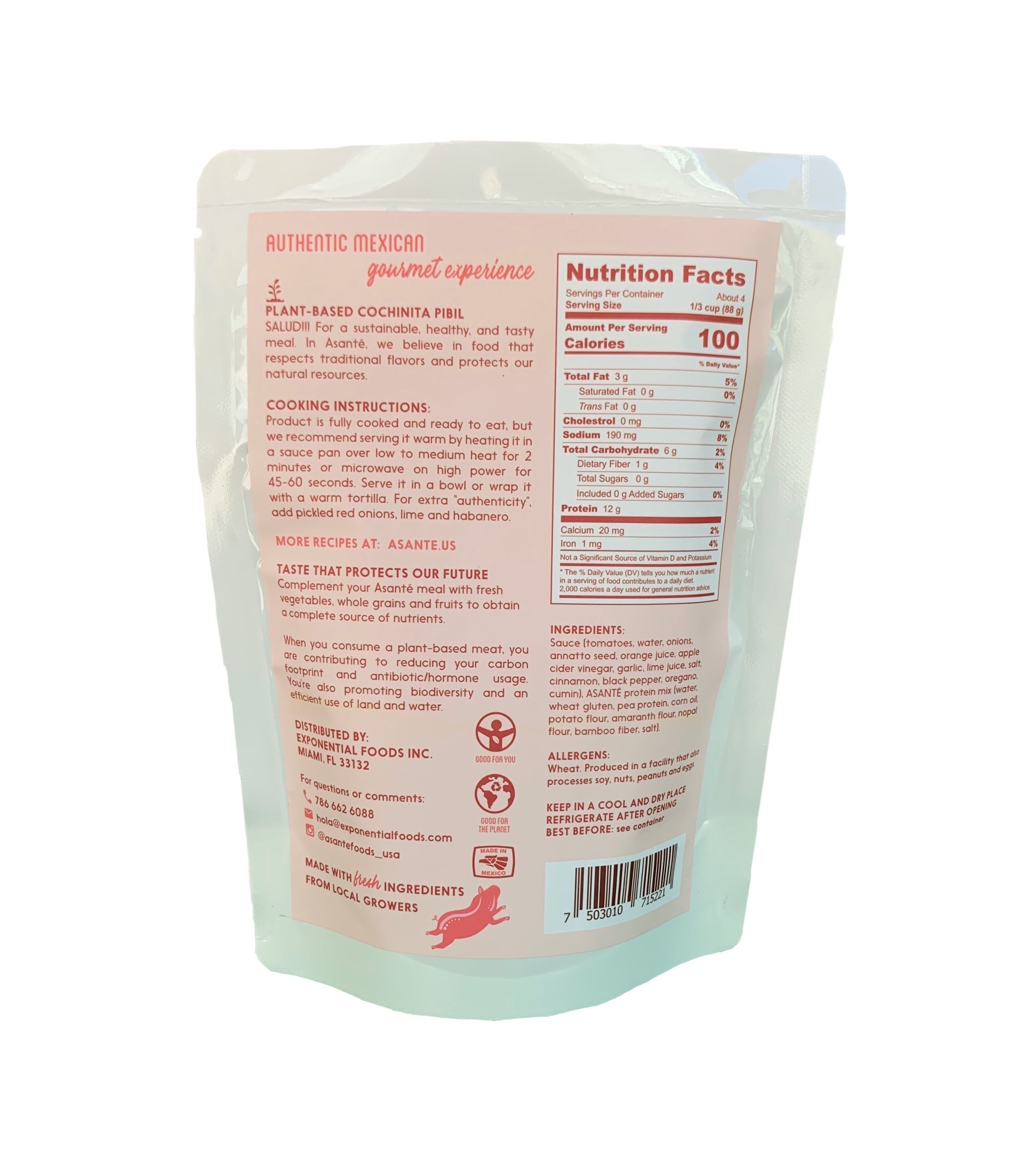 Handcrafted by artisan cooks, Asanté’s proprietary plant-based protein filets* are slow-cooked with modern culinary techniques to have a unique, juicy, firm and meaty texture.We accompany our filets with a rich sauce made from fresh ingredients from local growers. As many abuelitas, taqueros and chefs would say, the secret is in the Salsa. We use tomato, onion, annatto-seeds, orange juice, non-spicy peppers, garlic, lime juice, salt, apple cider vinegar, cinnamon, black pepper, oregano, and cumin.Our Cochinita Pibil is one of the most popular dishes in Mérida, Yucatán. A Cochinita Pibil is usually slow-cooked and eaten in a taco or tostada.Our Cochinita Pibil is fully cooked and only needs a personal touch to enjoy an authentic experience,Tastes delicious cold and can be great for salads, or hot in Tacos, enchiladas or bowls mixed with rice or noodles (great pairing with Asian food). For extra “authenticity” add pickled red onions, lime and habanero peppers.We are certain that our kindlier version will help us to transition into a plant-based diet.*Our plant-based protein filets are made from wholesome ingredients: wheat gluten, pea protein, wholegrain amaranth flour, corn oil, potato flour, nopal flour, bamboo fiber and salt.