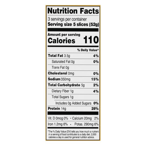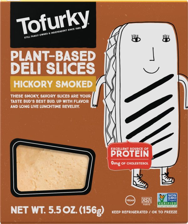 Deli Slices, Hickory Smoked, Vegan, Box 5.5 OZ All vegan. Vegan. Excellent source of protein. No saturated fat. Cholesterol free. Non-GMO ingredients. Non GMO Project verified. Rich & tender. Smokehouse cured. Plant-based. Still family owned & independent since 1980. These slices are ready to eat out of the pack cold or heated. You can't fake smoky taste like this. These deli slices spend time in the smokehouse stoked with real hickory wood chips to infuse them with naturally smoky flavor. We support many causes to raise awareness for people, animals and our planet. Certified B Corporation. The friendliest food on the plate. tofurky.com. Facebook. Twitter. Instagram. Certified 100% recycled paperboard. Please recycle. This packaging was made with recycled materials and low VOC inks. Recycle it. Made with (heart) in Oregon. Use within 3-5 days of opening. Keep refrigerated. Contains: soy, wheat. 5.5 oz (156 g) 602 Anchor Way Hood River, OR 97031