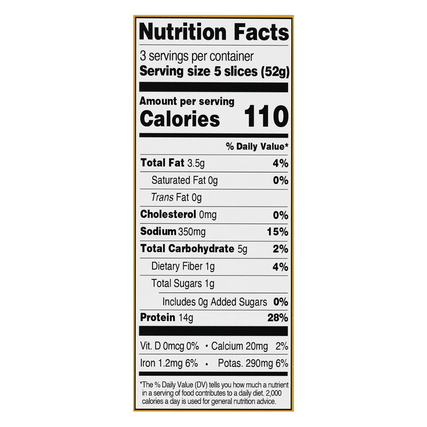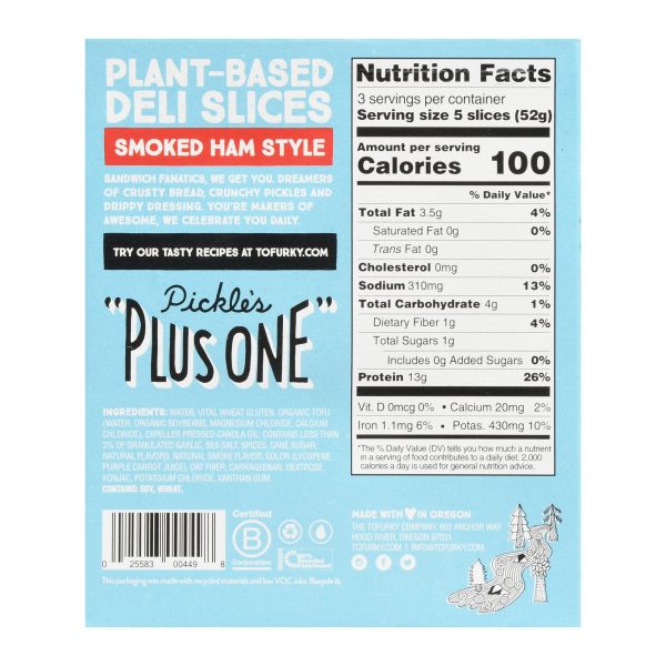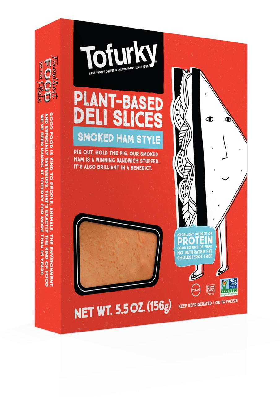 Deli Slices, Smoked Ham, Vegan, Box 5.5 OZ Family owned and independent since 1980. Gourmet, meatless and delicious! Vegan. We have been working on ham for years trying to capture the smoky yet sweet flavor profile that causes taste buds to sing. We feel we’ve finally created a ham that deserves the Tofurky name. Delicious enough to eat cold by the slice and hearty enough to use on a sandwich with a good rye bread, mustard, crunchy veggies and vegan cheese – the slice can’t be beat. The main difference between our product and the ham you may have loved growing up is that this little piggy stayed home. Tofurky.com. Low VOC inks. 100% recycled paperboard. . Keep refrigerated. Contains: wheat, soy. 5.5 oz (156 g) PO Box 176 Hood River, OR 97031