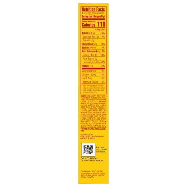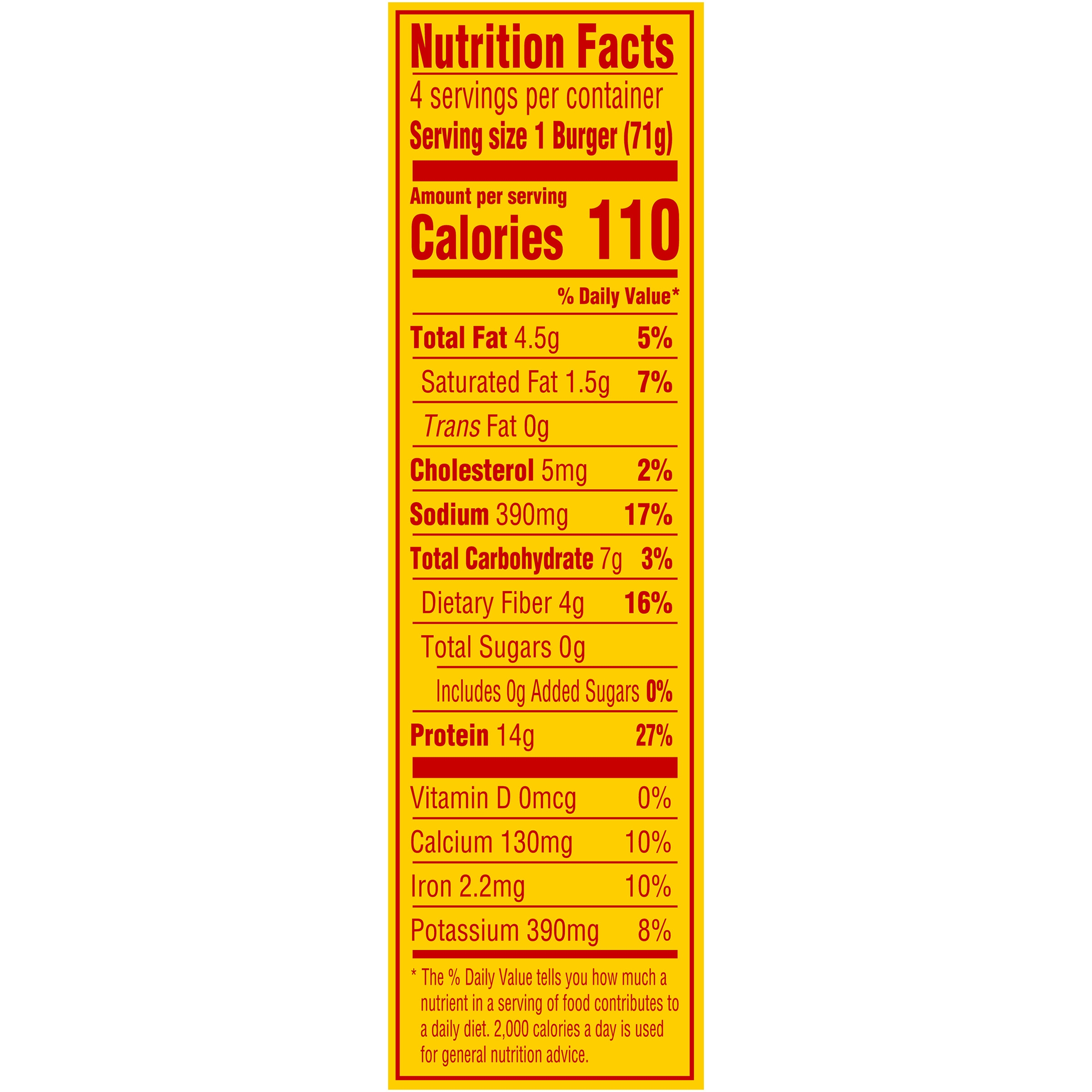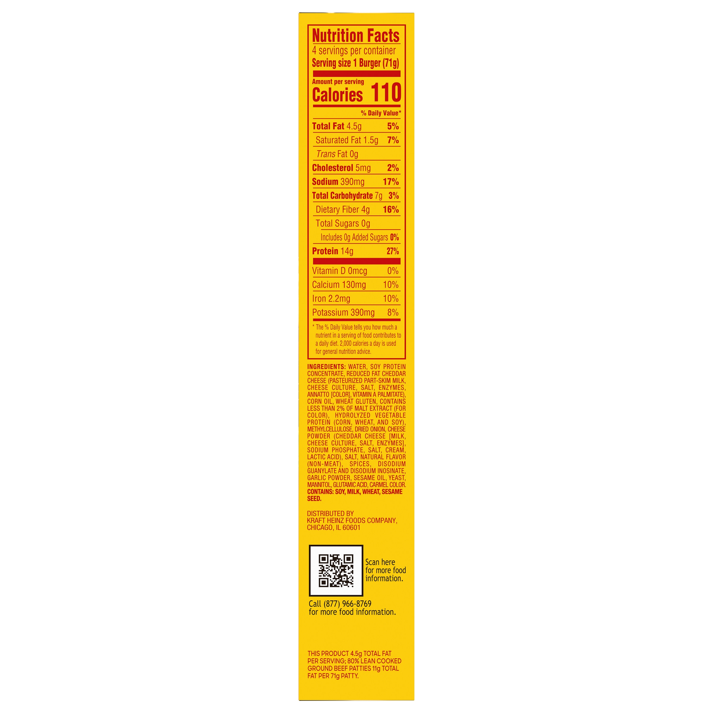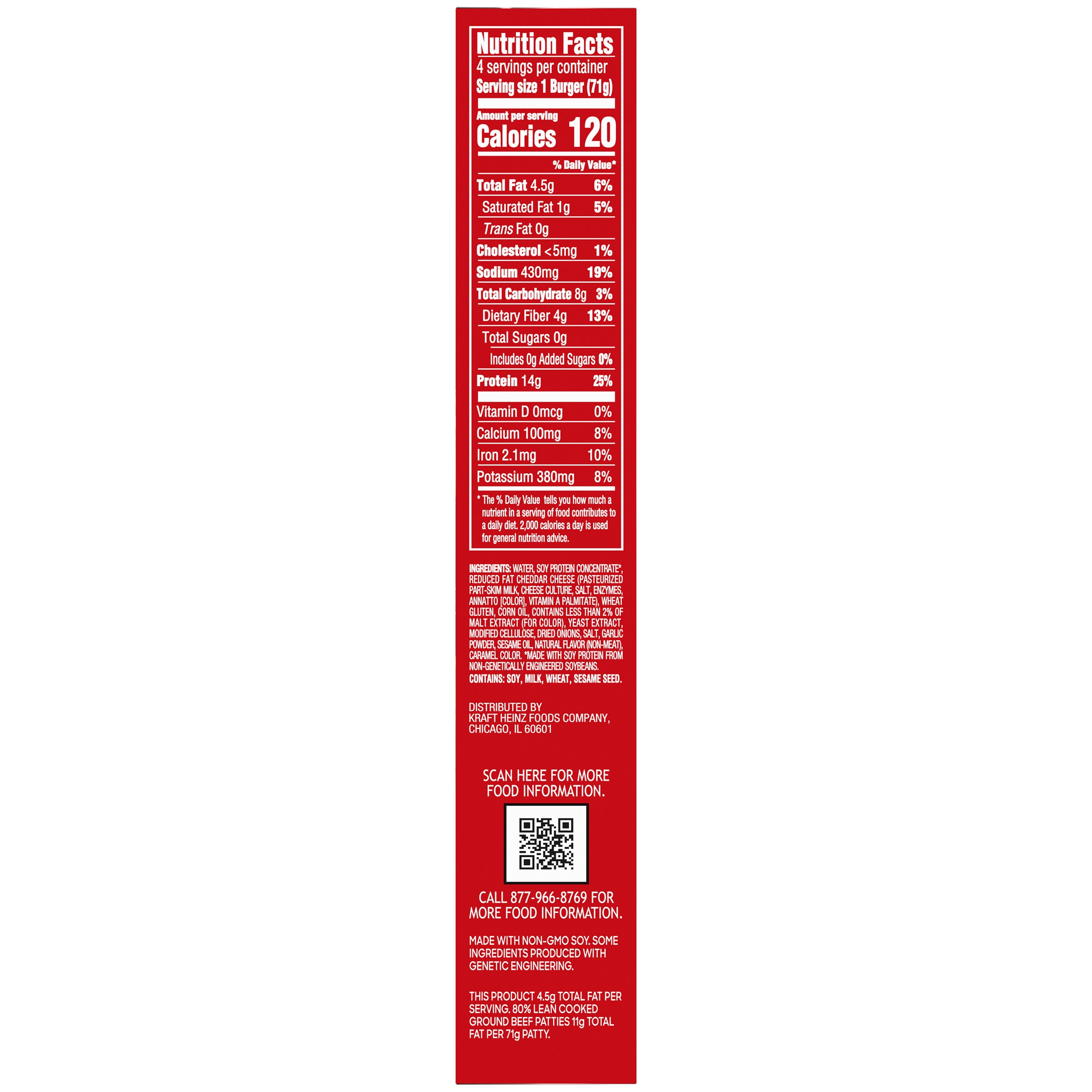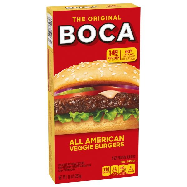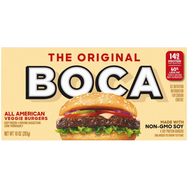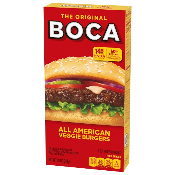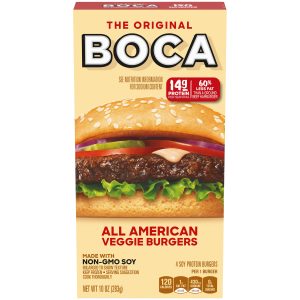 BOCA The Original All American Veggie Burgers are a tasty alternative to traditional hamburgers, making them a perfect vegetarian friendly frozen entree. You won’t miss ground beef one bit with these flavorful meatless patties. Made with garlic, onion and cheddar cheese, these veggie patties are packed full of flavor. These veggie burgers deliver 13 grams of protein and 100 calories per serving. For a quick and delicious vegetarian meal, cook one in your conventional or microwave oven, or throw a meatless burger on the stove top or grill. One 10 ounce box includes 4 soy protein burgers and should be stored in the freezer.