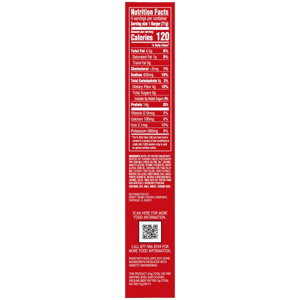 BOCA Non-GMO Soy All American Veggie Burgers are a delicious alternative to ground beef. These easy to make meatless veggie burger patties are a wonderful choice for vegetarians or for anyone who prefers a substitute that’s 60% less fat than a ground beef hamburger. These patties are high in protein, and one frozen burger patty contains 100 calories. Made from non-GMO soy protein, these juicy, perfectly textured and seasoned soy burgers are sure to please even the pickiest burger lovers. Cooking veggie burger patties in the oven or microwave is a breeze, or simply toss them on the grill until they’re cooked thoroughly. The 10 ounce carton comes with 4 frozen patties that stay fresh in the freezer long-term, so you always have a satisfying vegetarian meal option available when you only a hearty burger will do.