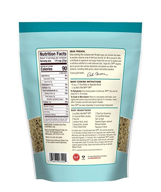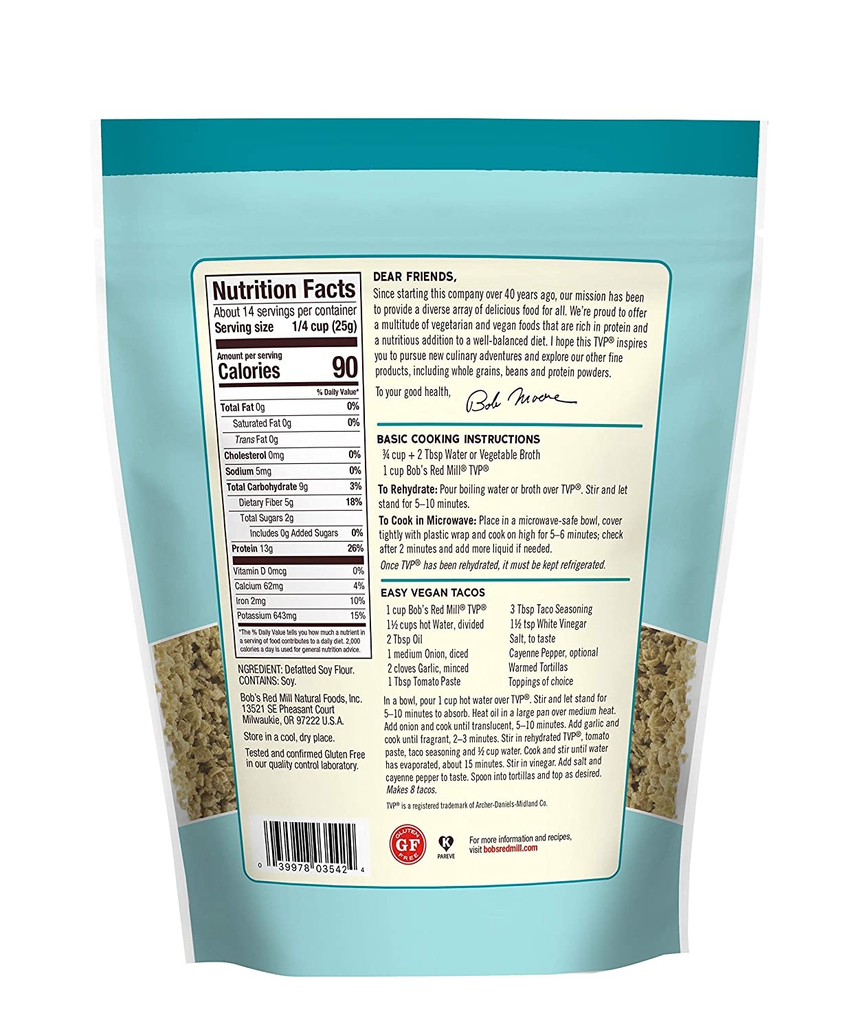 Now Gluten Freedom® is easy! Bob’s Red Mill Textured Vegetable Protein is made from soybeans and is ideal for use as a meat extender or gluten free vegetarian meat substitute in virtually any recipe calling for ground beef or turkey. Great for tacos, meatloaf, chili, sloppy joes and more.