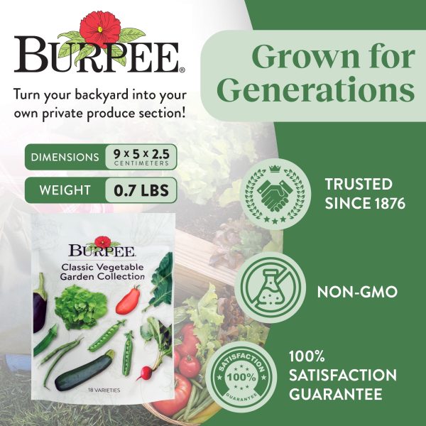 Turn your backyard into your own private produce section with the Burpee Heirloom Collection Gardening Seeds for planting vegetables! This classic garden collection contains 18 varieties of seeds, and each packet of food seeds for planting contains over 15,000 high-quality seeds to produce spectacular, mouth-watering results. Our veggie seeds for planting a home garden are always non-GMO, so you can depend on us to create the garden of your dreams. These veggie garden seeds include 18 different vegetables, with select varieties of garden bean seeds, beet seeds, cauliflower seeds, celery seeds, collard green seeds, cucumber seeds, eggplant seeds, kale seeds, lettuce seeds, okra seeds, onion seeds, pea seeds, sweet pepper seeds, radish seeds, summer and winter squash seeds, tomato seeds and turnip seeds. Our food seeds for planting will create delicious salads and sides for home cooking, and growing instructions are included on each seed packet. At Burpee, we’ve been the gardener’s best friend since 1876, and offer over 1000 varieties of seeds for planting vegetables – so you can grow the garden of your dreams with America’s most trusted seed company! Our vegetables seeds are always non-GMO, and our garden vegetable seeds for outdoor spaces will add versatile, delicious veggies to your home garden, so you can enjoy your own personal produce section. You can’t grow wrong with this Classic Heirloom Vegetable Seed Variety Pack! – Product Details: (1) Heirloom Vegetable Collection Seed Packet, 18 Seed Variety – Dimensions: 9 x 5 x 2.5 inches – Contents: 15,000+ Seeds