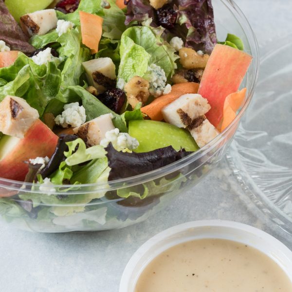 Taylor Farms Apple and Walnut Salad with Chicken brings together a fresh blend of tender green leaf and spring mix topped with crisp apple slices, grilled white meat chicken, carrots, blue cheese crumbles, glazed walnuts, cranberries, featuring a sweet onion vinaigrette. You’ll fall in love with this delicious lunch option that comes conveniently packaged with fork and dressing included. Ready to eat and bursting with flavor, our Taylor Farms on-the-go salads are the perfect choice for any lifestyle.