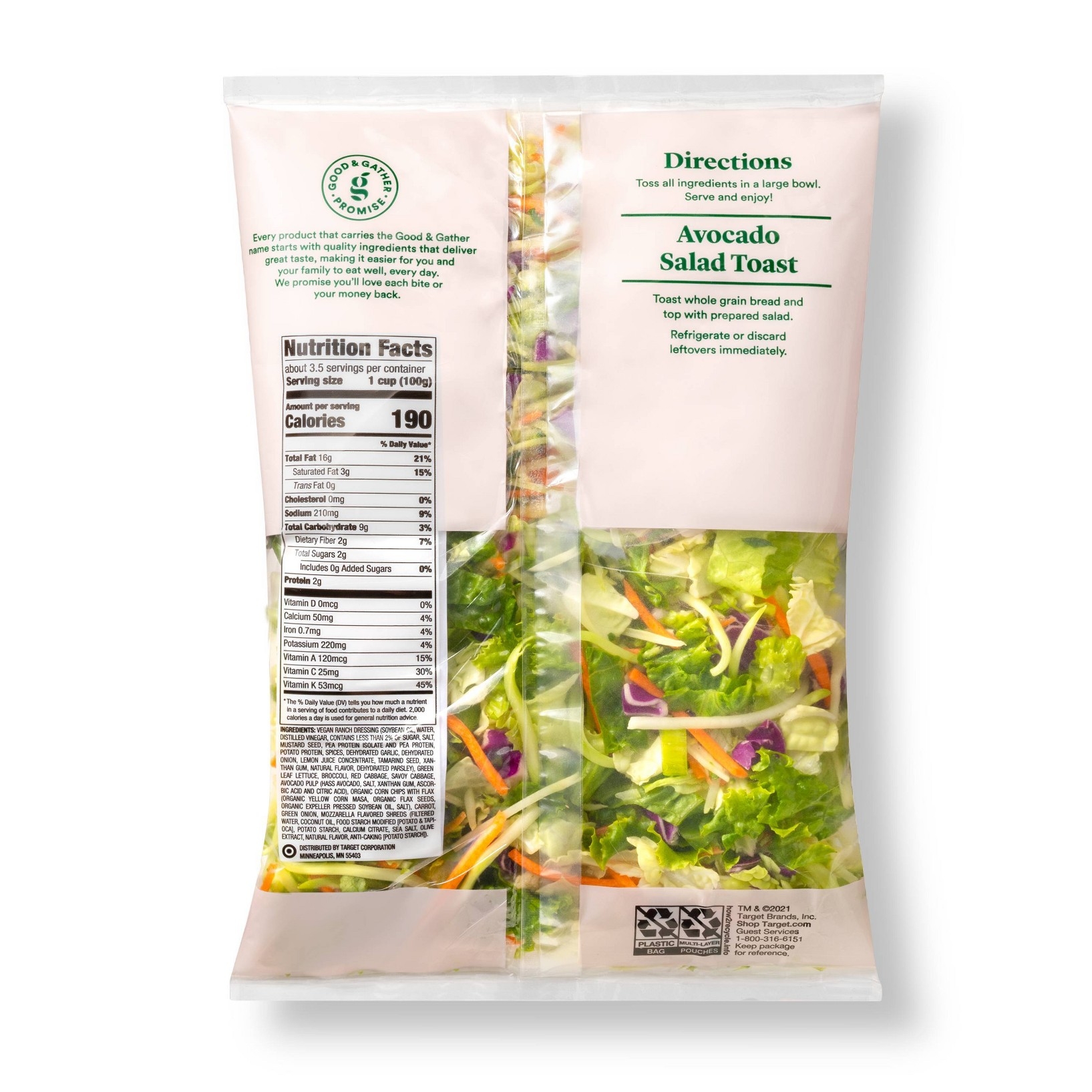 u0026bull;Good u0026 Gather vegan chopped salad kitu003cbru003eu0026bull;Shredded green leaf lettuce, broccoli stalk, red and savoy cabbage, real Hass avocado, corn chips with flaxseed, carrot, green onion, and non-dairy mozzarella flavored shreds ranch dressingu003cbru003eu0026bull;Great combination of flavors and textures for a delicious vegan salad creationu003cbru003eu0026bull;Net wt 13oz