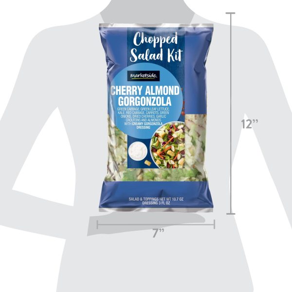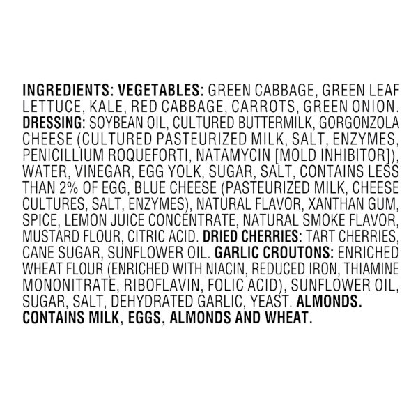 Green Cabbage, Romaine Lettuce, Kale, Red Cabbage, Carrots, Green Onion, Dried Cherries, Garlic Croutons and Almonds, with Creamy Gorgonzola Dressing. Our Marketside Cherry Almond Gorgonzola Chopped Salad Kit is a ready-to-mix bag of delicious fresh vegetables and salad dressing. The base of the salad is made with a crisp blend of hearty green cabbage, romaine lettuce, kale, and red cabbage. This base is combined with crunchy carrots, green onions, almonds, garlic croutons, and sweet dried cherries for an irresistible medley of flavors and textures. Each kit includes a container of creamy Gorgonzola dressing, so you can dress the salad to your liking. Make lunch easy with a Marketside Cherry Almond Gorgonzola Chopped Salad Kit. Fresh ideas and quality ingredients, that’s how Marketside brings the best foods to your table. We are committed to delivering freshness that you can taste and see. Marketside offers the best in fresh food, guaranteed by Walmart, working in partnership with farmers, bakers, and chefs for the highest quality, authentic ingredients, and favorite recipes.