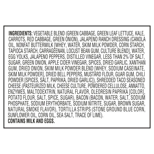 The Marketside Bacon Ranch Crunch Salad Kit comes loaded with a refreshing mix of green cabbage, green leaf lettuce, carrots, kale, red cabbage, green onions, taco seasoned shredded cheese, bacon, tortilla strips, and comes with a jalapeno ranch dressing. This salad is absolutely delicious either on its own or as a side dish. Just add juicy pan-seared chicken breast to make it a hearty dinner or pair it with a burger off the grill for a fun summer meal. It comes packaged, washed, and ready to eat for your convenience. Add some bold flavors to the menu with our Marketside Bacon Ranch Crunch Salad Kit.Fresh ideas and quality ingredients, that’s how Marketside brings the best foods to your table. We are committed to deliver freshness that you can taste and see. Marketside offers the best in fresh food, guaranteed by Walmart, working in partnership with farmers, bakers and chefs for the highest quality, authentic ingredients and favorite recipes.