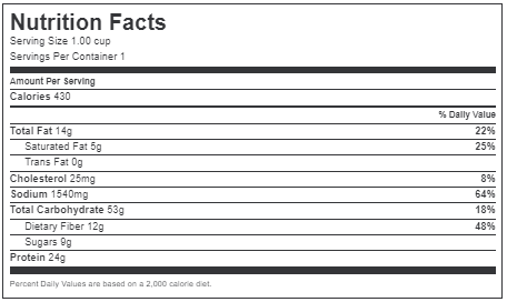 Water, Tomato Puree (water, Tomato Paste), Kidney Beans, Seasoned Beef And Pork Crumbles (beef And Pork, Salt, Spice Extractive), Contains Less Than 2% Of: Green Peppers, Modified Food Starch, Red Peppers, Spices, Soy Protein Concentrate, Dehydrated Onions, Salt, Sugar, Dehydrated Garlic, Paprika, Caramel Color.