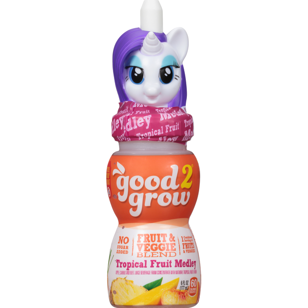 good2grow?s 6oz Fruit and Veggie Blend Tropical Fruit Medley juice provides kids with a full serving of fruits and vegetables and has no added sugar. good2grow offers hundreds of collectable character tops that come with a spill proof valve to prevent leaks.