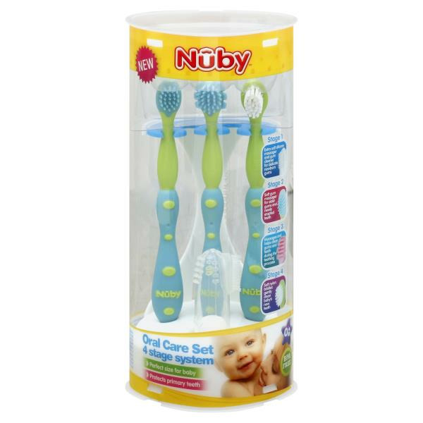 New. Stage 1: Extra soft silicone massager and gum cleaner for delicate newborn gums. Stage 2: Soft gum massager for older gums and newly erupted teeth. Stage 3: Massages and helps clean gums and teeth during the teething process. Stage 4: Soft nylon bristles gently clean baby’s new teeth. Perfect size for baby. Protects primary teeth. BPA free. See insert for warnings and instructions. www.nuby.com. 1-800-LuvnCare (USA only). Scan me with QR Code app or visit us at www.nuby.com. Facebook: Facebook.com/nubyusa.com. The Nuby Oral Care Set promotes the early development of good dental hygiene. The soft materials and bristles are designed especially with a child in mind. The result of this special attention to detail is a product you and your child can use with ease. The first stage allows parents to brush and massage gums gently, while the second massages and helps gently clean as teeth begin to erupt. The third stage massages and cleans during the teething process. Ask your doctor or dentist about when to switch to the soft nylon brush (stage 4) once teeth begin to grow fully in. The stage 4 bristle design provides a smooth transition. All Nuby products are made of safe, durable materials and exceed all government safety regulations and standards. We are working together with you to simplify parenting and make life a little easier for you and your baby. DCLP: Deaf Child Literacy Project. This purchase will help support Deaf Children’s Literacy Project. Made in China.