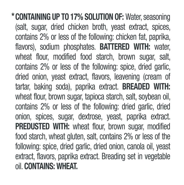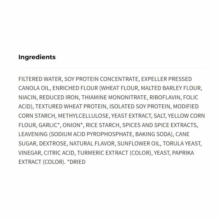 Filtered water, soy protein concentrate, expeller pressed canola oil, enriched flour (wheatflour, maltedbarleyflour, niacin, reduced iron, thiamine mononitrate, riboflavin, folic acid), textured wheat protein, isolatedsoyprotein, modified corn starch, methylcellulose, yeast extract, salt, yellow corn flour, garlic*, onion*, rice starch, spices and spice extracts, leavening (sodium acid pyrophosphate, baking soda), cane sugar, dextrose, natural flavor, sunflower oil, torula yeast, vinegar, citric acid, turmeric extract (color), yeast, paprika extract (color) (*dried).