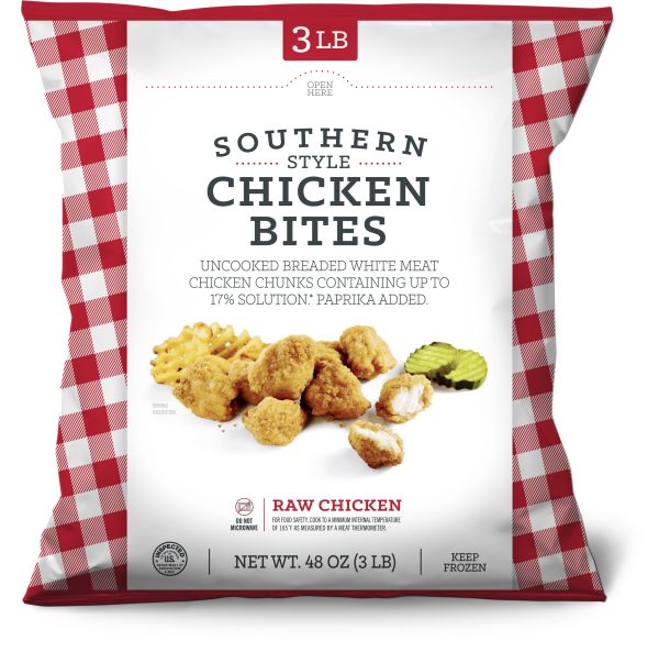 Southern Style Chicken Bites are uncooked breaded white meat chicken chunks, frozen and packaged in a resealable bag for your convenience.