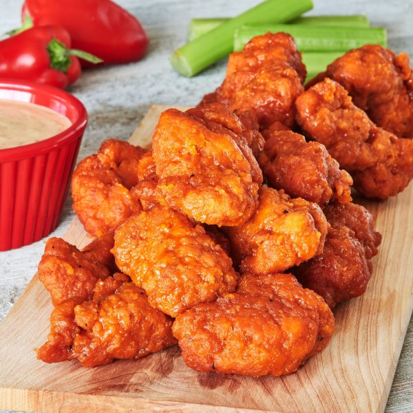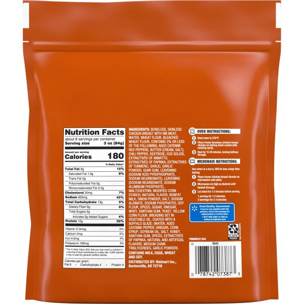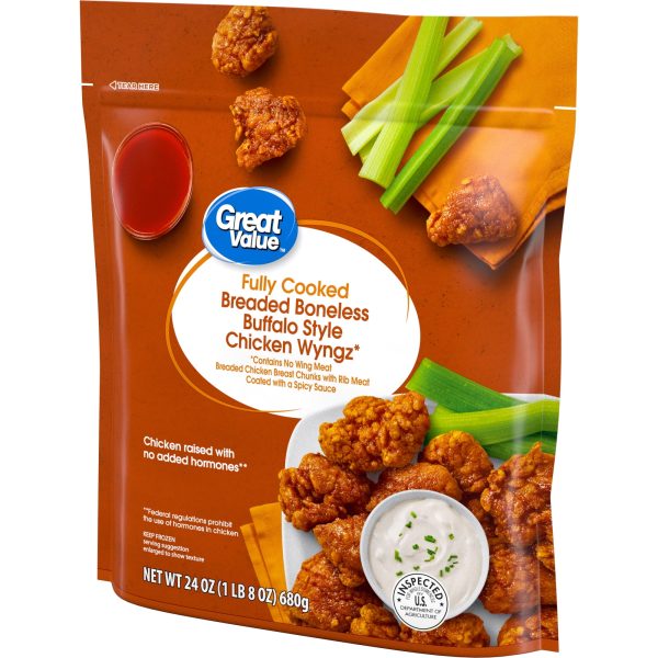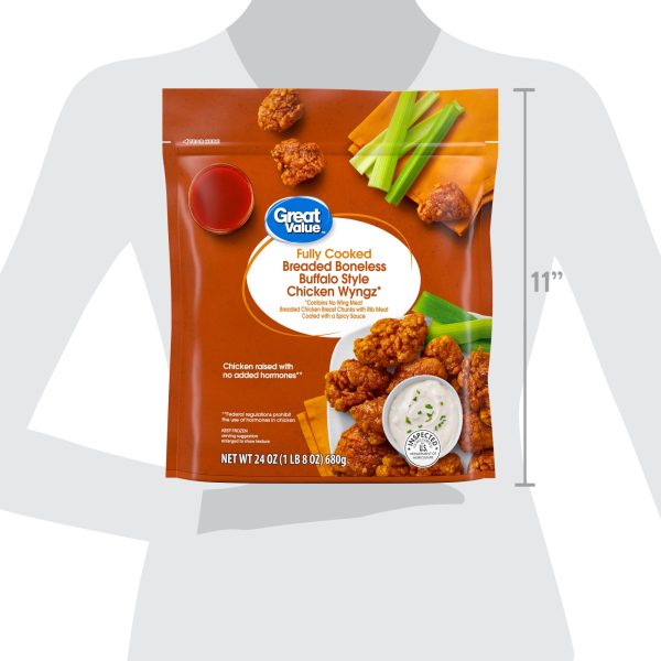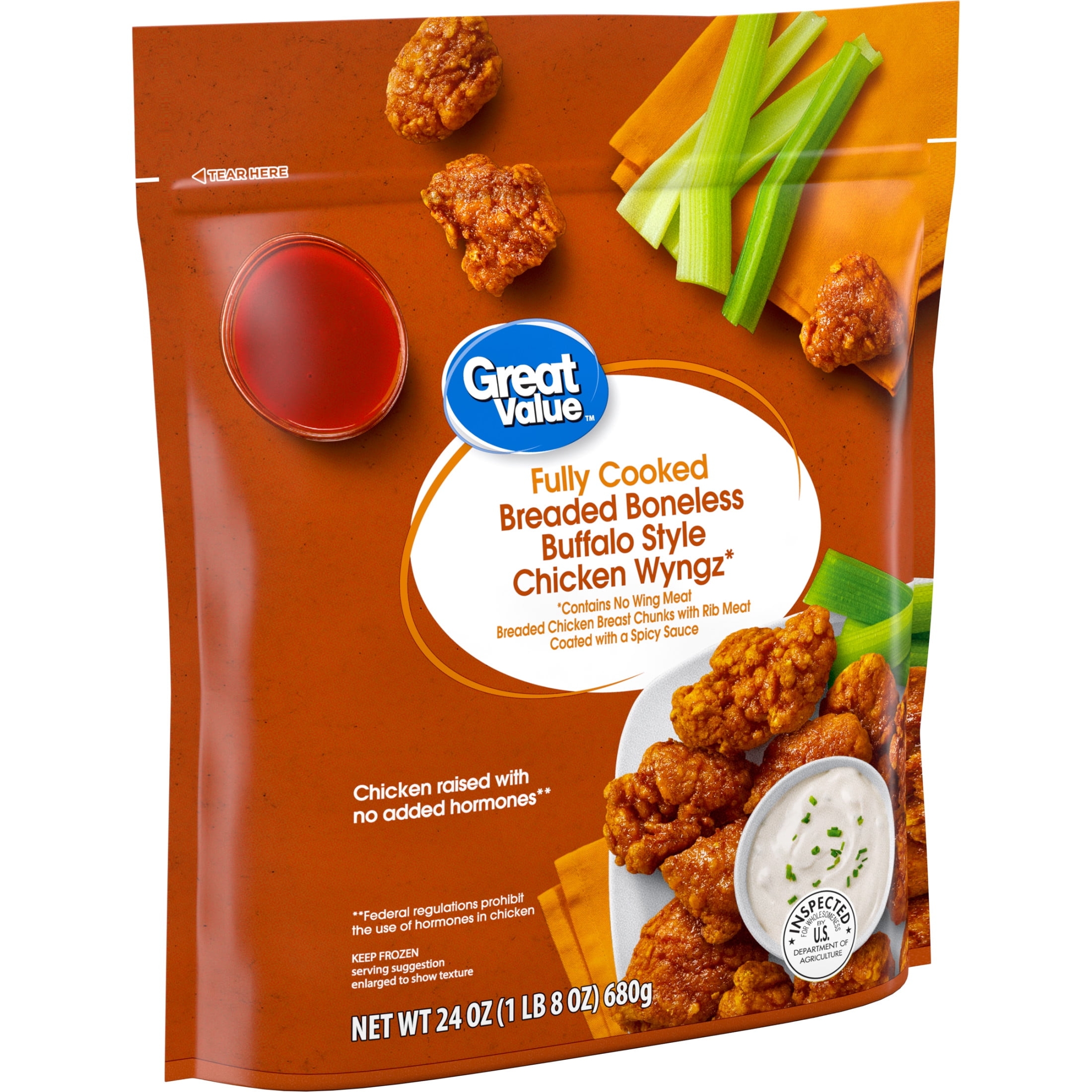 Impress family and friends alike at your next gathering with Great Value Buffalo Style Seasoned Boneless Fully Cooked Breaded Chicken Wyngz. These fully cooked chicken wings are a great tasting, quick, and convenient meal for the entire family. Breaded and covered in a spicy and savory buffalo style seasoning, these delicious chicken wings contain eleven grams of protein per serving. A perfect weekday meal with family or as an appetizer for a weekend gathering, these fully cooked frozen chicken wings are easy to prepare. Simply place in an oven, air fryer or microwave until hot. Includes one 24 ounce package of Great Value Buffalo Style Seasoned Boneless Fully Cooked Breaded Chicken Wyngz.