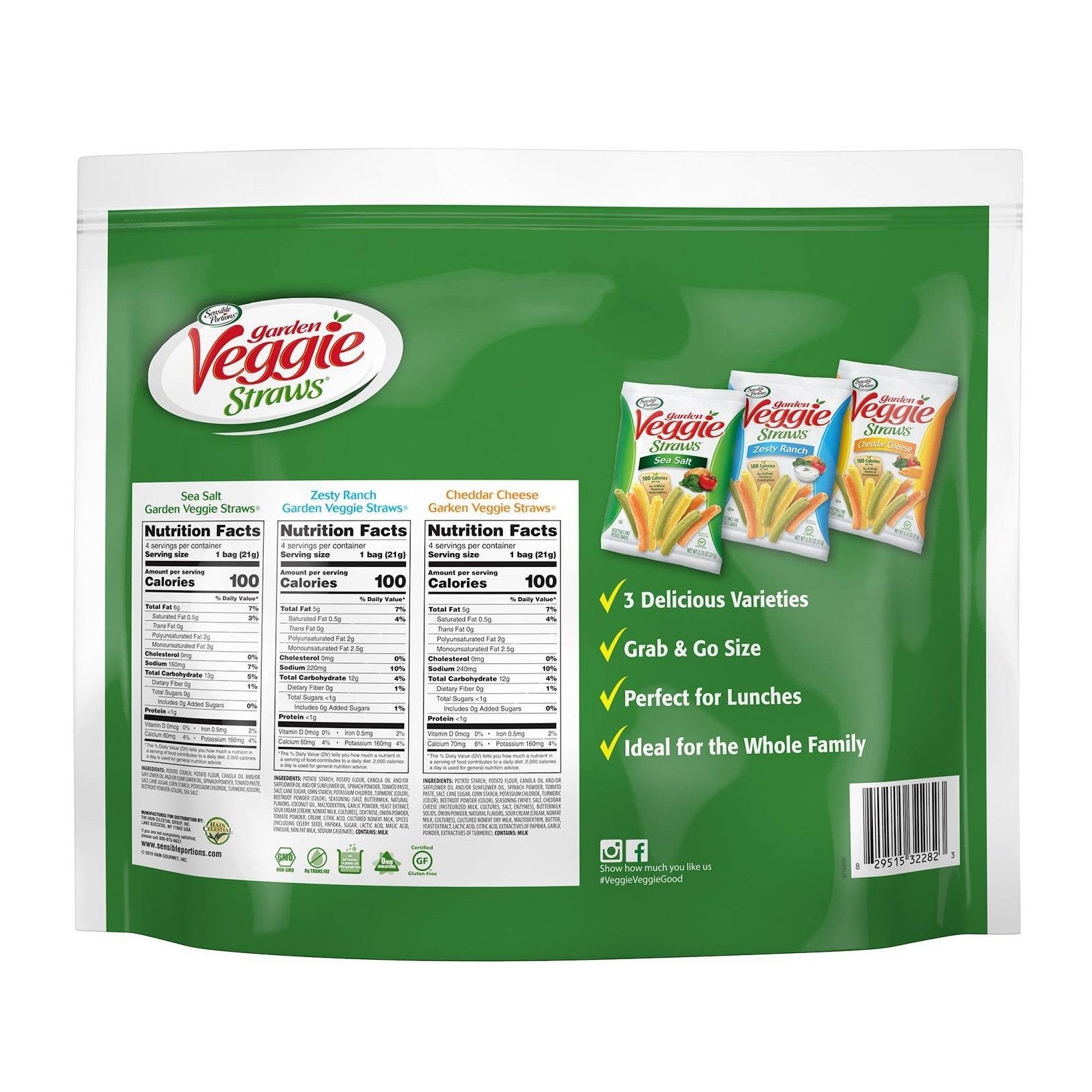 u003cbr /u003eu003cbr /u003eu003cbr /u003eu003cbr /u003eu003cbr /u003e u003cbr /u003eu003cbr /u003e u003cbr /u003e u003cbr /u003eSensible Portions Veggie Straws have the crispy crunch and taste-bud-tantalizing flavor you want in a snack, but without all of the artificial flavors and artificial preservatives that you don’t. Our better-for-you veggie straws have 30% less fat than the leading brand of potato chips*, are non-gmo, have 0mg cholesterol and 0g trans fat per serving, and they’re also Certified Kosher and gluten-free. Each variety pack contains 4 bags each of Sea Salt, Zesty Ranch and Cheddar Cheese Veggie Straws. These individual bags make packing lunch a snap, or on-the-go snacking a breeze. At Sensible Portions brand, we believe you shouldn’t have to compromise on taste when choosing a better-for-you snack. That’s why each of our products are made with delicious, wholesome ingredients that pack fun and flavor, not artificial preservatives, fillers or artificial flavors. It’s also why we continue to expand our portfolio to offer a variety of snacking choices that include vegan and organic options, so everyone in your family can be happy and satisfied. *Our veggie straws contain 7g fat per serving compared to the leading potato chip brand at 10g of fat per serving.